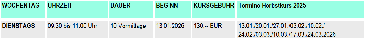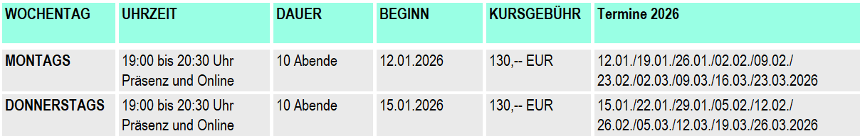 Kurszeiten und Kursgebühren siehe nachfolgende Terminblöcke.